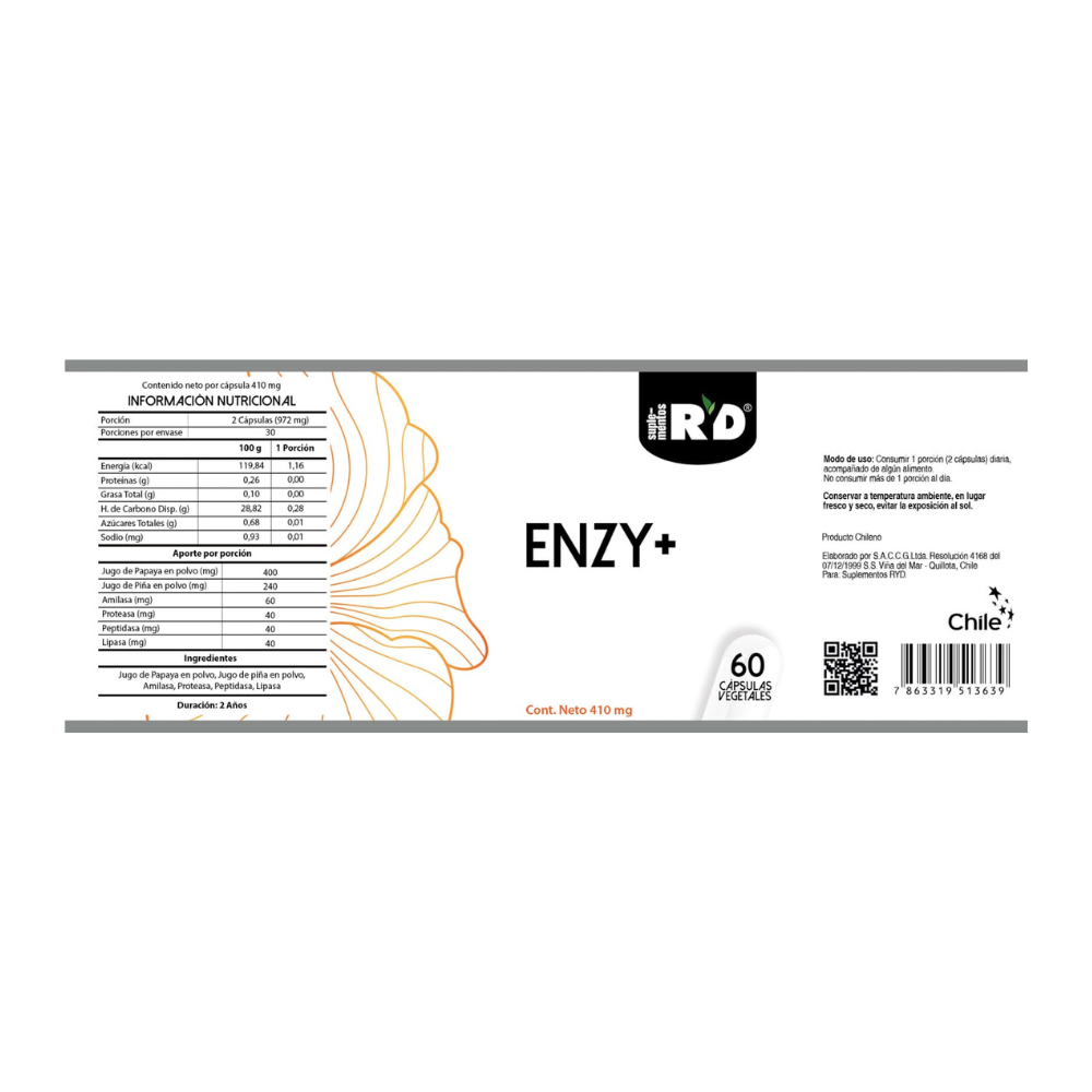 Ingredientes: Jugo de Papaya en polvo, Jugo de Piña en polvo, Amilasa, Proteasa, Peptidasa, Lipasa